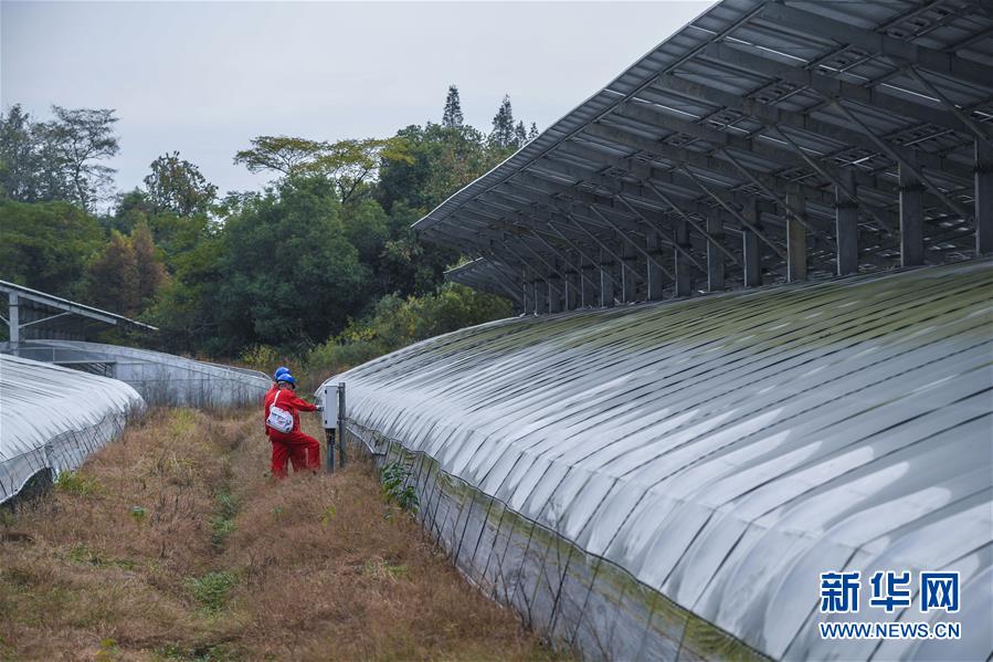10月31日,在长兴县东盛光伏农业科技园,工作人员检查光伏设备运行情况。 位于浙江省长兴县虹星桥镇谭家村的东盛光伏农业科技园,占地面积1460亩,园内建有光伏科技农业大棚325个,棚顶光伏板持续发电,棚下种植鲜切花、美国红枫、红豆杉等经济作物,实现“一地两用”。该项目于2015年10月正式并网,助农增收超过4000万元。 新华社记者 徐昱 摄