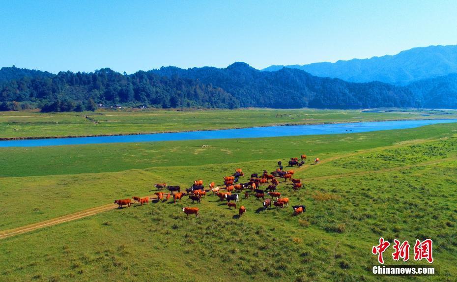 溪流岸线旁成群的黄牛在觅食,构成了一幅清新自然的生态山乡风景画。邓和平摄