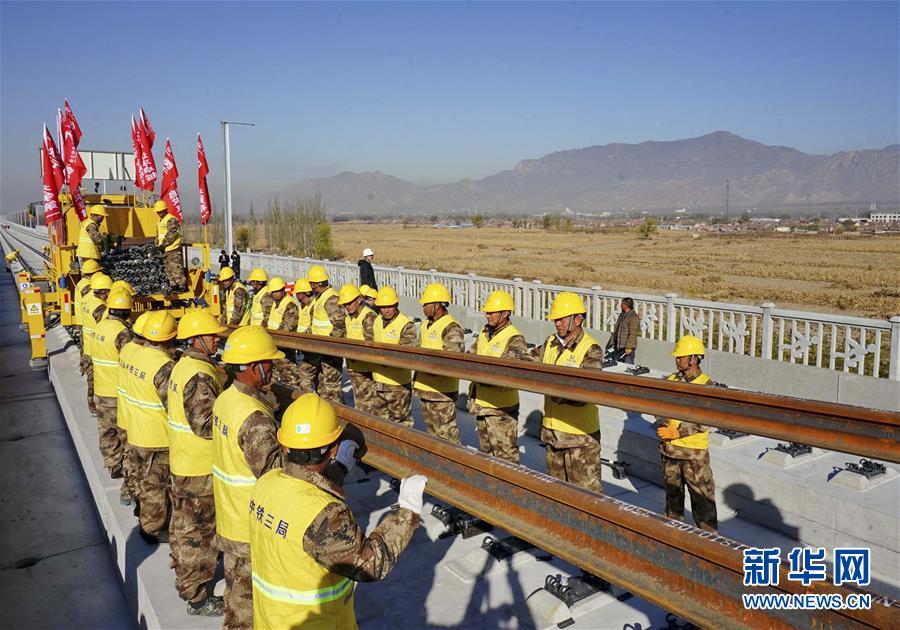 11月1日,在京张高铁河北怀来段铺轨现场,中铁三局的工人正在铺设京张高铁全线第一节轨排。
