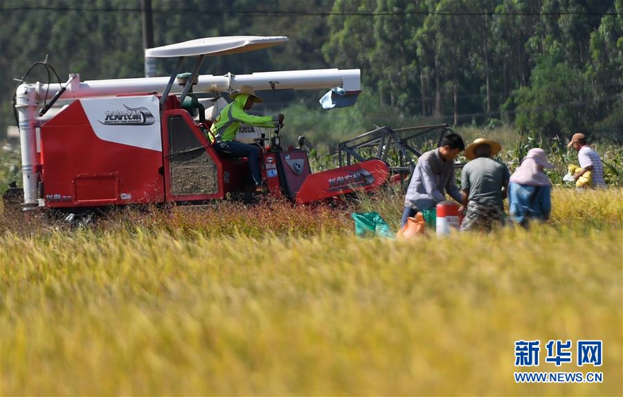 10月31日,农民操控收割机在广西钦州市钦南区康熙岭镇长坡村抢收晚稻。 新华社记者张爱林摄