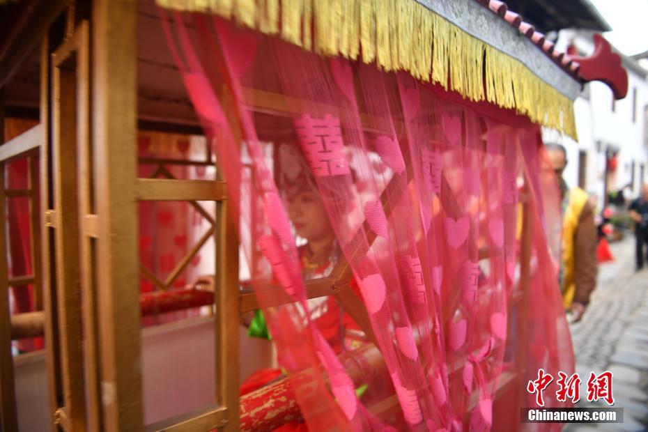 10月24日,浙江丽水市景宁大均村,婚俗体验环节中,畲族新娘坐花轿。丽水地处浙江省西南部,辖莲都区、龙泉市、景宁等9个县(市、区)。景宁大均村历史文化悠久,自然、人文景观佳丽。大均村是国家4A景区,也是体验民族风情和传统民俗所在地。畲乡之窗景区建立以来,篝火晚会、泼水节、畲族婚嫁表演、渡亲节等系列民族体验活动,成为大均村旅游的招牌,吸引了越来越多的游客前来体验。中新社记者 刘冉阳 摄