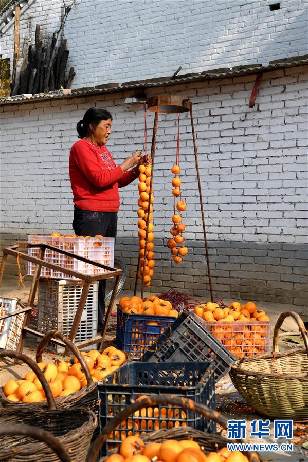 深秋时节,山西省运城市平陆县坡底乡前马泉沟村的柿子喜获丰收,村民抓紧将柿子去皮、晾晒,制作柿饼。 新华社记者 杨晨光 摄