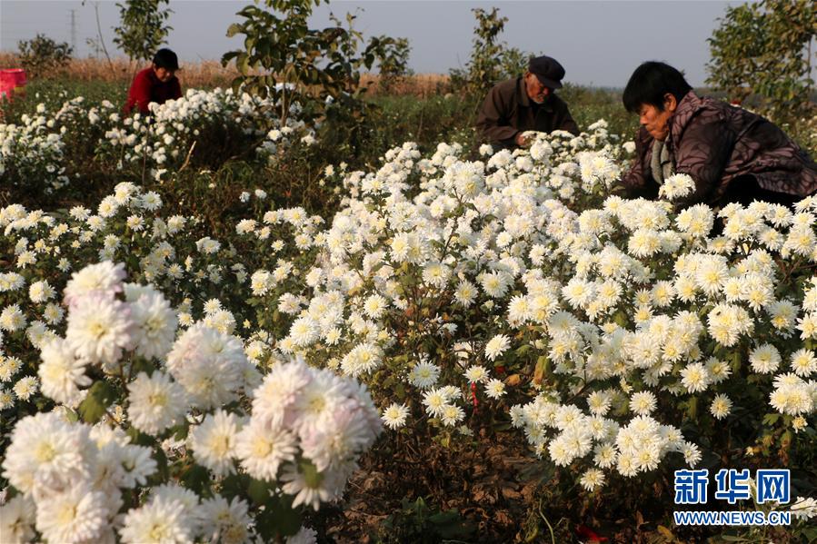 11月1日,河北省广平县十里铺乡金安村村民在采收菊花。