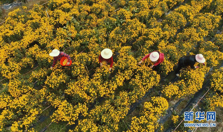 11月1日,广西龙胜各族自治县平等镇昌背村村民在花田里采摘菊花(无人机拍摄)。 新华社发(潘志祥 摄)