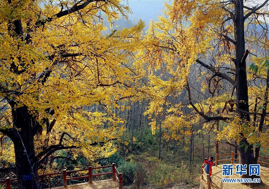 11月1日,游客在河南省嵩县白河乡下寺村古银杏树下拍摄秋景。 深秋时节,河南省嵩县白河乡下寺村的古银杏林为小山村披上了“金甲”。漫天黄叶,遍地金色,一幢幢民居掩映在色彩斑斓的世界里,美不胜收,吸引了众多游客赏景拍照。 新华社记者 李安 摄