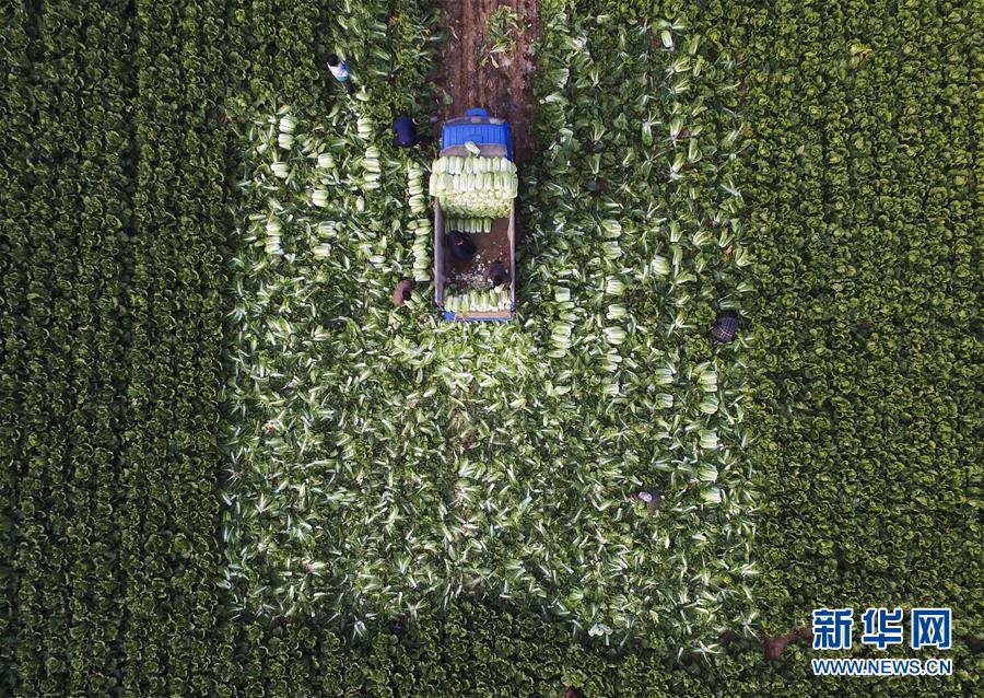 11月2日,河北省玉田县唐自头镇燕山口村农民在田间收获白菜(无人机拍摄)。立冬临近,河北省唐山市玉田县10万亩白菜喜获丰收,农民们抢抓冬前晴好天气,收获、储存、外运白菜,田间一片忙碌景象。新华社发(刘满仓 摄)