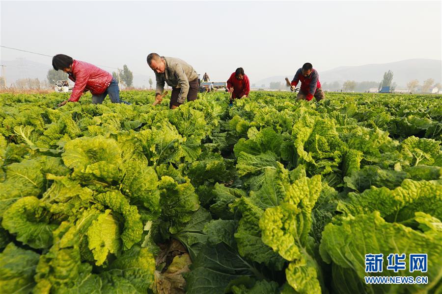 11月2日,河北省玉田县唐自头镇燕山口村农民在田间收获白菜。立冬临近,河北省唐山市玉田县10万亩白菜喜获丰收,农民们抢抓冬前晴好天气,收获、储存、外运白菜,田间一片忙碌景象。新华社发(刘满仓 摄)