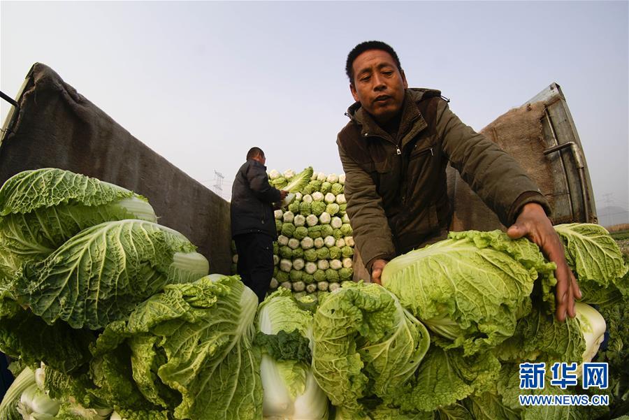 11月2日,河北省玉田县唐自头镇燕山口村农民将白菜装车外运。立冬临近,河北省唐山市玉田县10万亩白菜喜获丰收,农民们抢抓冬前晴好天气,收获、储存、外运白菜,田间一片忙碌景象。新华社发(刘满仓 摄)