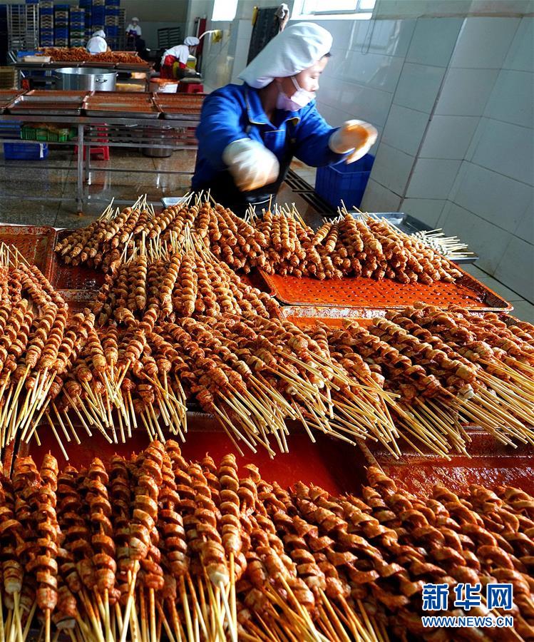 11月3日,在贵溪市泗沥镇红又红实业公司的车间里,工人们忙着制作烧烤肉串,这些肉串将经过消毒、真空包装、冷藏等工序后销售。工人们都是来自周边村庄的农民,他们利用农闲到这里打工,在家门口就业增收。 新华社记者 宋振平摄