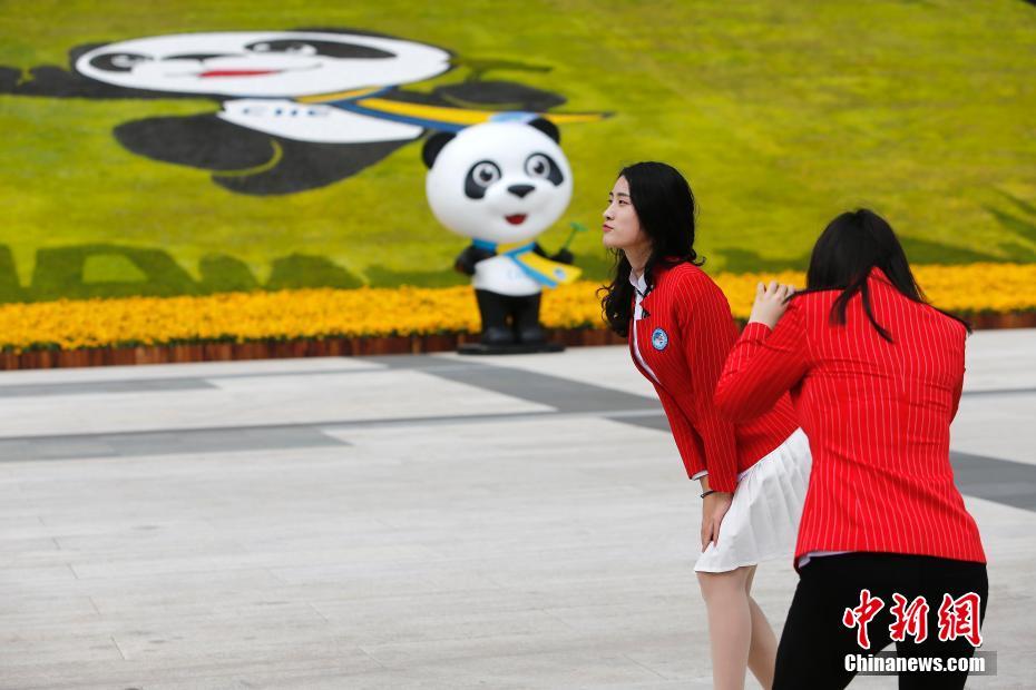 11月4日,志愿者在国家会展中心南广场上,与中国国际进口博览会吉祥物合影留念。5日,首届中国国际进口博览会将在上海的国家会展中心开幕。 中新社记者 殷立勤 摄