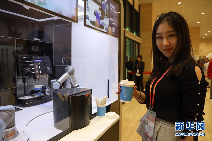 11月4日,一位媒体记者在首届中国国际进口博览会新闻中心无人咖啡亭品尝咖啡。 新华社记者 刘大伟 摄