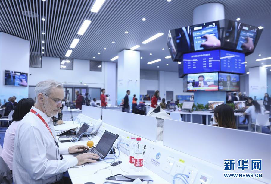 11月5日,媒体记者在首届中国国际进口博览会新闻中心工作。当日,首届中国国际进口博览会在上海开幕,吸引众多中外媒体记者前来报道。新华社记者 兰红光 摄