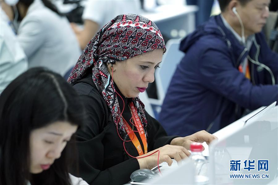 11月5日,媒体记者在首届中国国际进口博览会新闻中心工作。当日,首届中国国际进口博览会在上海开幕,吸引众多中外媒体记者前来报道。新华社记者 沈伯韩 摄