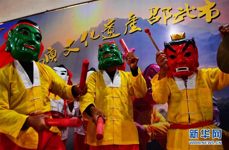 福建省邵武市大埠岗镇河源村的傩舞舞者在展示邵武傩舞的基本动作(11月4日摄)。 福建省南平市的邵武傩舞始于宋代,迄今已传承上千年,以驱疫逐鬼、祈福禳灾为主要目的,流行于邵武市大埠岗、和平、肖家坊、金坑等乡镇。舞者头戴面具,脑后缀一块红布,以没有故事情节、没有说唱的原始舞蹈动作走村串户,有着明显的古傩韵味,被誉为古代舞蹈“活化石”。 新华社记者魏培全摄