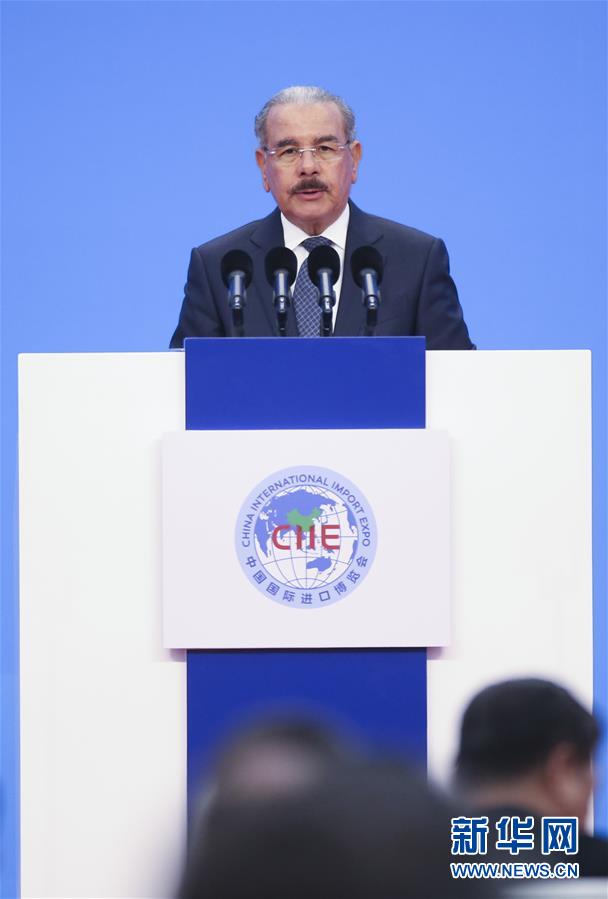 11月5日,首届中国国际进口博览会在上海开幕。这是多米尼加总统梅迪纳在开幕式上致辞。 新华社记者姚大伟摄