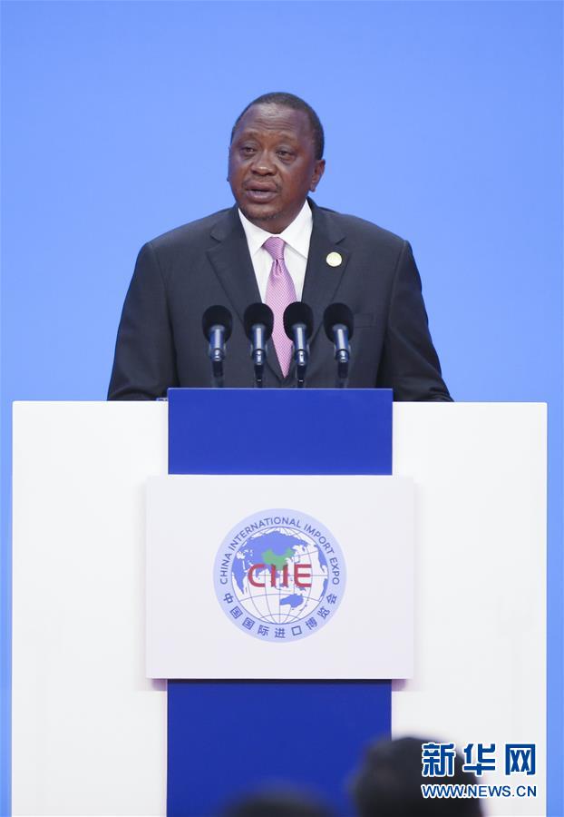11月5日,首届中国国际进口博览会在上海开幕。这是肯尼亚总统肯雅塔在开幕式上致辞。 新华社记者姚大伟摄