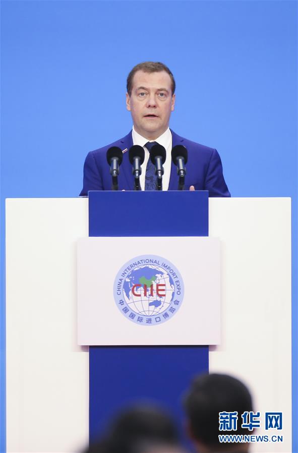 11月5日,首届中国国际进口博览会在上海开幕。这是俄罗斯总理梅德韦杰夫在开幕式上致辞。 新华社记者姚大伟摄