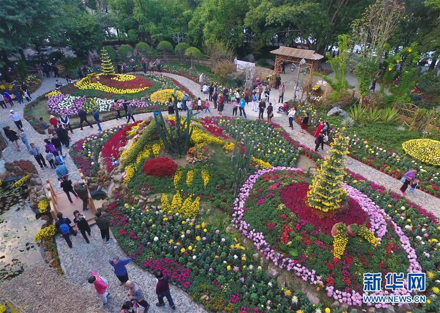 福州西湖公园菊花园由精品菊花组成的福州“三山两塔”景观(11月5日无人机拍摄)。 新华社记者林善传 摄