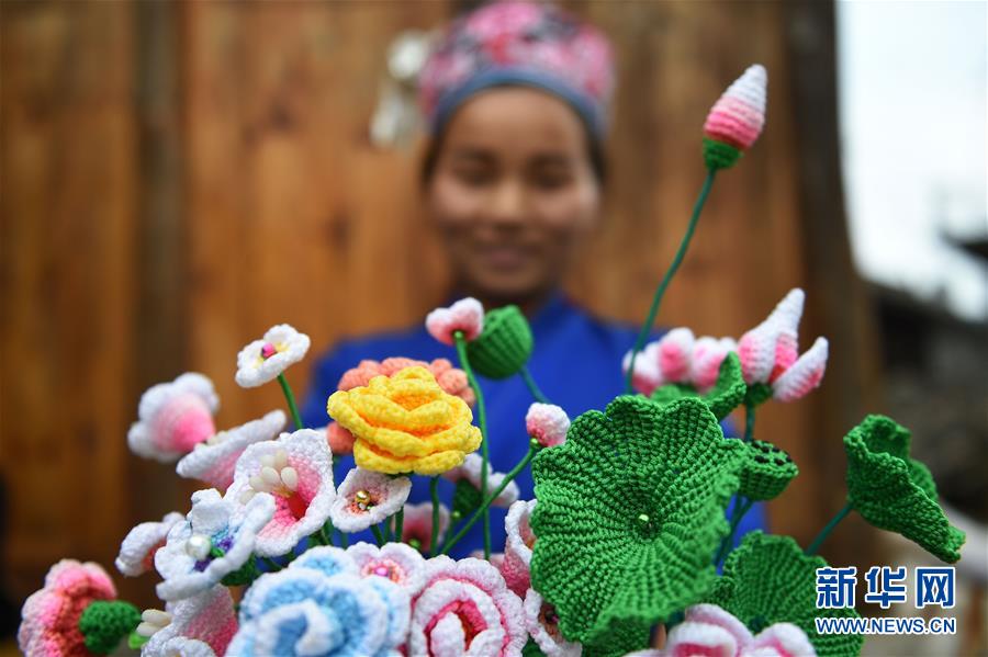 11月4日,杨兴和在展示毛线编织的饰品。 新华社发(刘开福 摄)