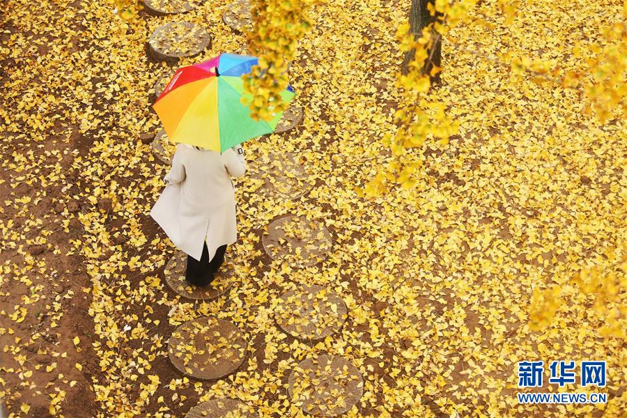 11月5日,游人在山东省临沂市郯城县重坊镇中华银杏园景区冒雨赏景。 新华社发(张春雷 摄)