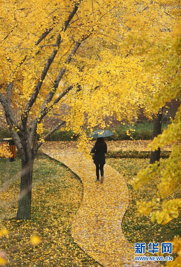 11月5日,游人在山东省临沂市郯城县重坊镇中华银杏园景区冒雨赏景。 新华社发(张春雷 摄)