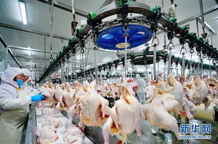 11月6日,滦南县一家肉鸡屠宰厂的工人在肉鸡分割生产线上工作。 新华社记者 杨世尧 摄