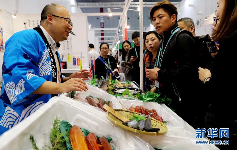 11月6日,工作人员(左)向参观者介绍由日本新鲜直送的海产品。 新华社记者 方喆 摄