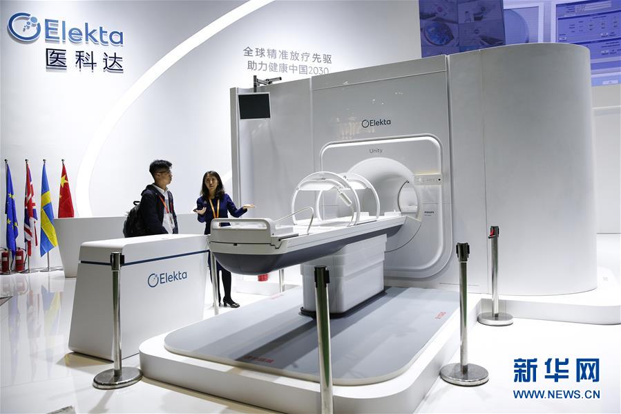 11月6日,瑞典医科达公司工作人员为一名记者介绍高场强磁共振放疗系统Elekta Unity。该款诊断级磁共振成像系统与先进的放疗加速器有机结合,可以在肿瘤放疗治疗的过程中实时、高分辨率地显示和追踪肿瘤的变化。 新华社记者 张玉薇 摄