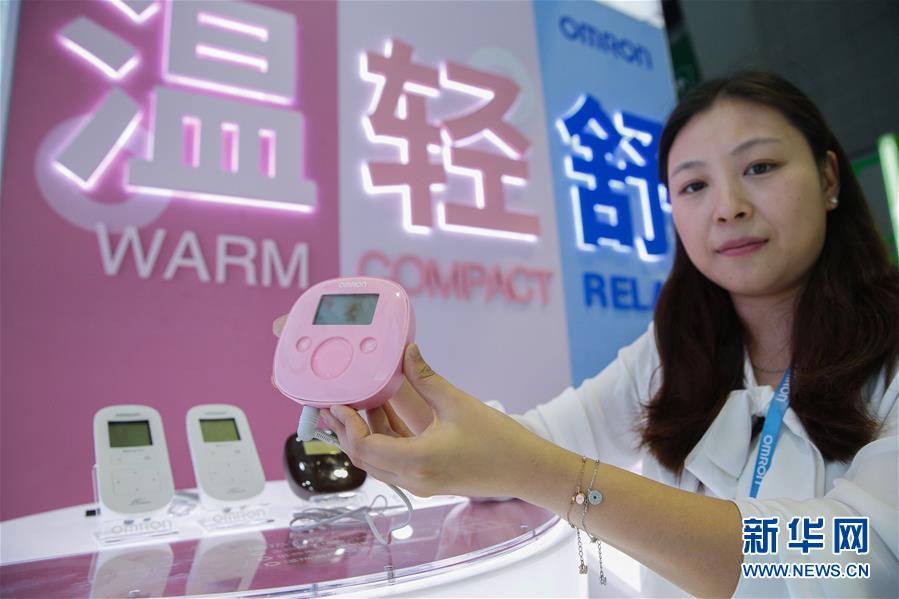11月6日,日本欧姆龙公司工作人员展示首次在中国亮相的新款温热低频治疗仪。该款产品搭载国际疼痛学会定义的能有效缓解女性生理痛的按摩频率。 新华社记者 张玉薇 摄