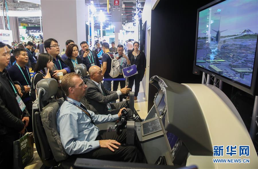 11月6日,参观者在美国波音公司展台体验“驾驶”波音客机。新华社记者 丁汀 摄