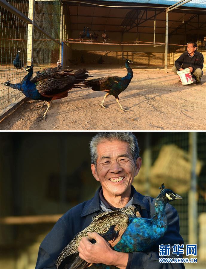 上图:沧州市盐山县姜庄村农民闫祖强在喂养孔雀(11月7日摄);下图:闫祖强抱着自己养殖的孔雀(11月7日摄)。闫祖强在当地家庭农场的扶持下从事孔雀养殖,每月有2000多元的收入。 新华社发(傅新春 摄)