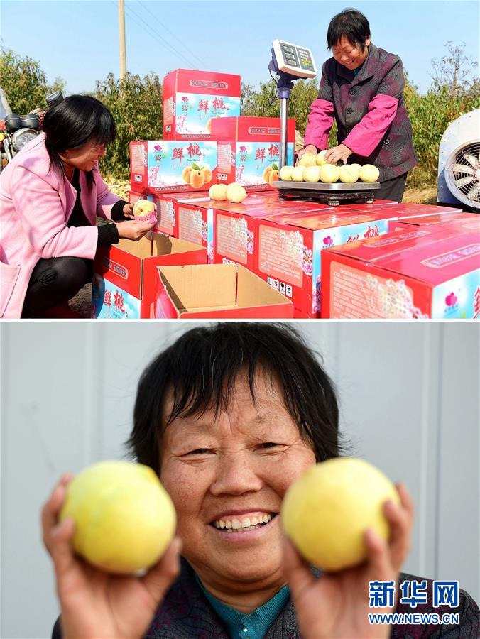 上图:沧州市东光县大单村村民在村里的晚熟桃种植基地包装桃子(11月6日摄);下图:沧州市东光县大单村村民单爱华展示收获的桃子(11月6日摄)。单爱华在在村里的晚熟桃种植基地务工,月收入2000多元。 新华社发(傅新春 摄)