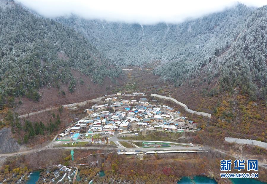 这是九寨沟景区内的树正寨及环寨所建的地质灾害治理工程拦石墙(11月6日无人机拍摄)。 新华社记者 刘坤 摄