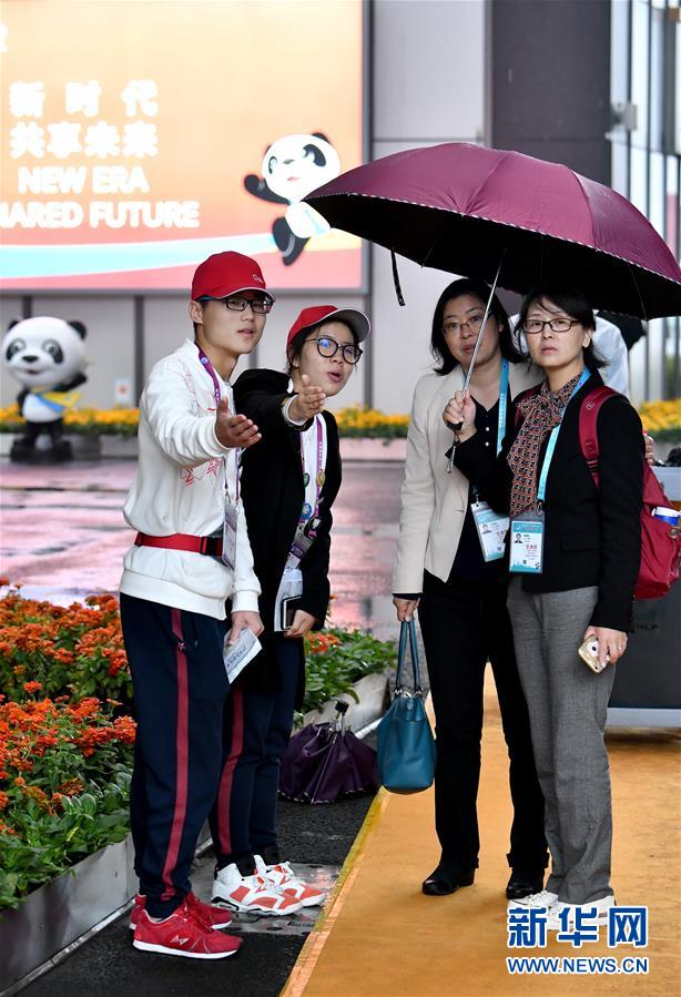 11月7日,进博会志愿者、上海中医药大学学生王杰(左一)和沈昱(左二)在为观众指引道路。 新华社记者 李鑫 摄
