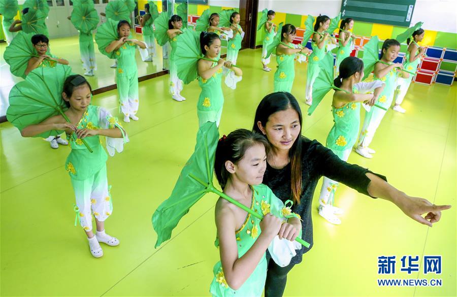 11月7日,河北省饶阳县第二实验小学“太阳花”舞蹈社团老师在辅导学生练习舞蹈动作。 新华社记者 李晓果 摄