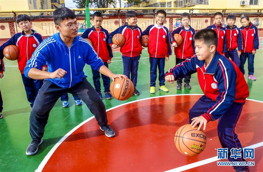 11月7日,河北省饶阳县第二实验小学篮球社团老师在指导学生进行运球训练。 新华社记者 李晓果 摄