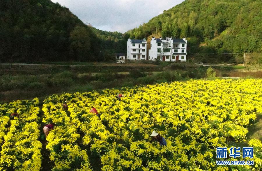 11月8日,婺源县思口镇农户在采摘皇菊(无人机拍摄)。 新华社记者 胡晨欢 摄
