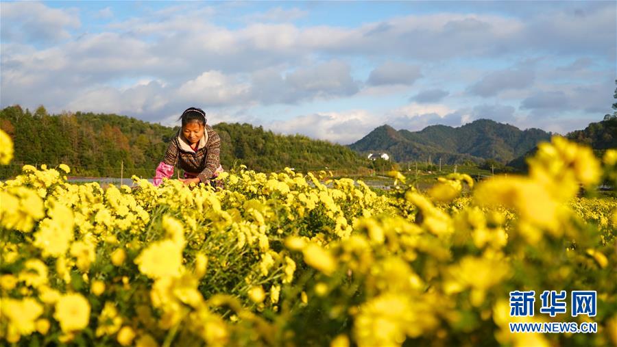 11月8日,婺源县思口镇农户在采摘皇菊。 新华社记者 胡晨欢 摄