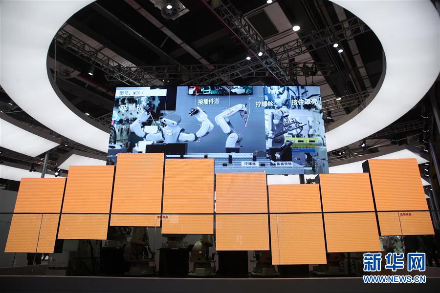 11月6日,日本那智不二越公司的8台同步表演系统机器人在进行展示。 新华社记者 丁汀 摄