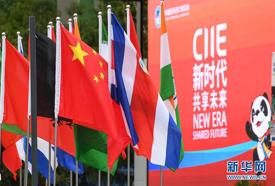 11月5日,在上海国家会展中心入口处,旗帜迎风飘扬。新华社记者 李贺 摄