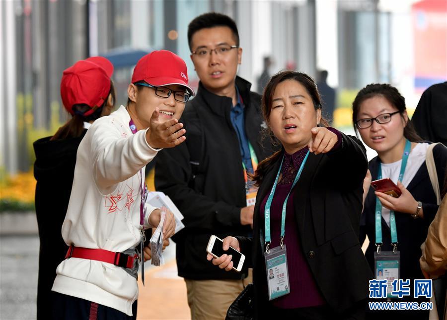 11月7日,进博会志愿者、上海中医药大学学生王杰(前左)在进博会上给参观者指路。新华社记者 李鑫 摄