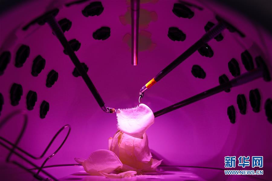11月8日,在进博会医疗器械及医药保健展区,达芬奇Xi手术系统在演示切割花瓣。新华社记者 刘大伟 摄
