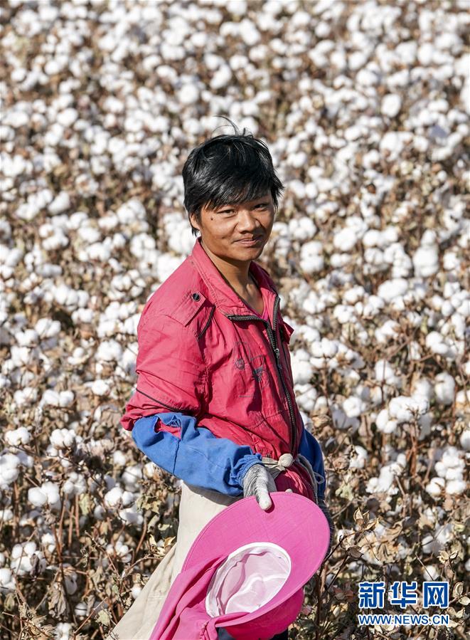 拾花工陈喜波在新疆巴楚县多来提巴格乡卡扎尼塔皮提村的棉田中(10月25日摄)。