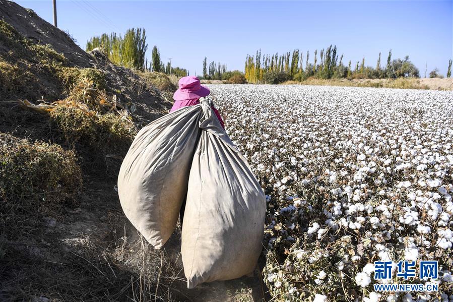 在新疆巴楚县多来提巴格乡卡扎尼塔皮提村,陈喜波背着两袋棉花行走在棉田里(10月24日摄)。