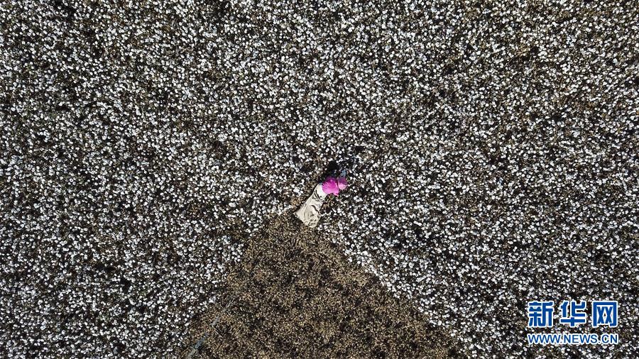 陈喜波的表嫂宋仙在新疆巴楚县多来提巴格乡卡扎尼塔皮提村的棉田中拾花(10月25日无人机拍摄)。