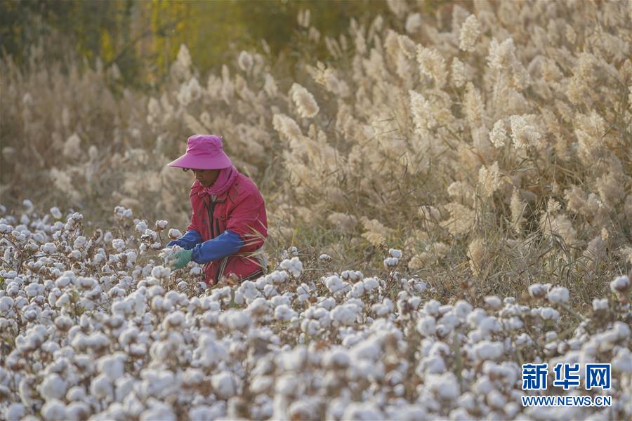 陈喜波在新疆巴楚县多来提巴格乡卡扎尼塔皮提村的棉田里拾花(10月30日摄)。
