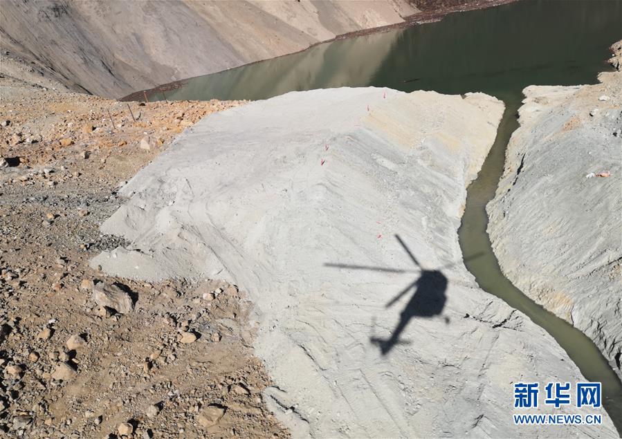 11月12日,金沙江堰塞湖水通过泄流槽。 新华社发(段恒昌 摄)