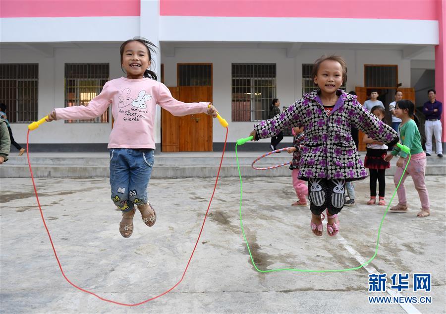 广西都安瑶族自治县东庙乡三团小学学生在课间跳绳(11月6日摄)。 60载奋进,60载辉煌。广西壮族自治区成立以来,特别是党的十八大以来,壮乡人民在党的民族政策光辉照耀下,守望相助、开拓创新,八桂大地正成为开放发展前沿。 近年来,广西全力落实中央部署,以扎实推动经济持续健康发展、扎实推进现代特色农业建设、扎实推进民生建设和脱贫攻坚、扎实推进生态环境保护建设、扎实建设坚强有力的领导班子等“五个扎实”新要求为工作指针,不断深化改革、扩大开放,富民兴桂的新蓝图正徐徐展开。 新华社记者 陆波岸 摄