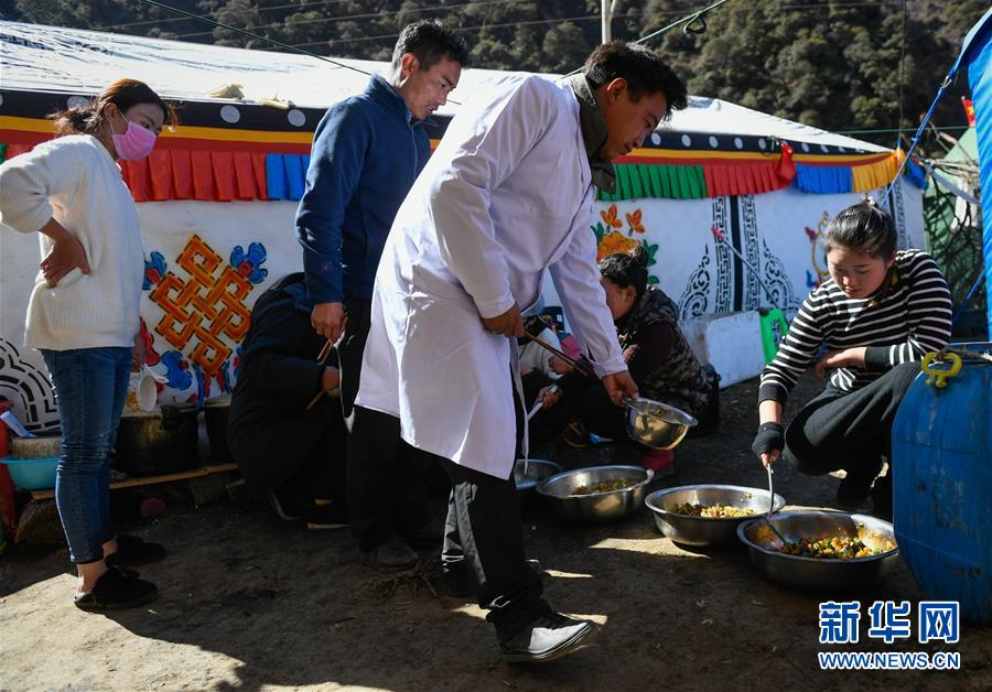 11月12日,在西藏昌都市江达县波罗乡康扎西安置点,工作人员在临时厨房打饭。 西藏自治区江达县波罗乡康扎西安置点,离波罗乡政府直线距离约3公里,位于一处地势开阔平缓的山谷中,比堰塞湖水面高出100多米。10月11日金沙江白格段山体滑坡发生后,当地就在这里设立了安置点,安置附近受灾群众。 新华社记者 刘东君 摄