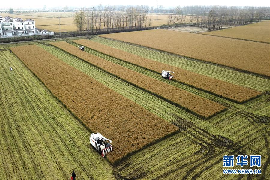 11月13日,在江苏省淮安市洪泽区东双沟镇,农民驾驶农机在田间收获水稻(无人机拍摄)。 近日,江苏省多地晚稻迎来收获季,当地农民抢抓晴好天气,确保水稻颗粒归仓,田间地头一片繁忙景象。 新华社发(万震 摄)